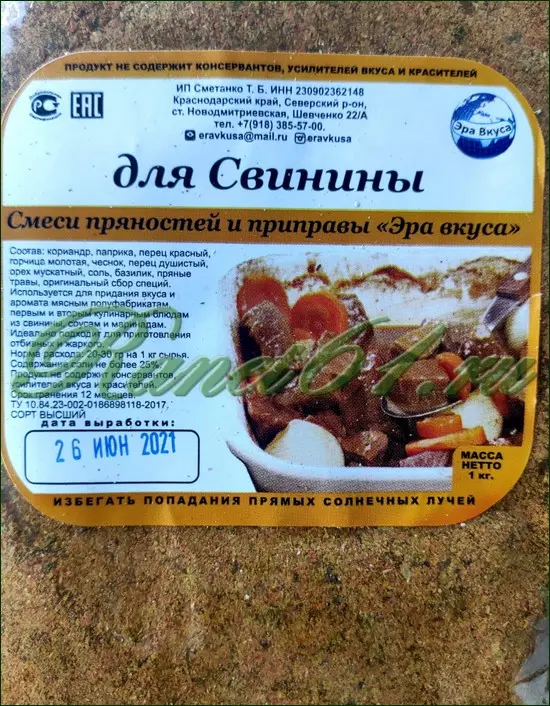 Состав: кориандр, паприка, перец красный, горчица молотая, чеснок, перец душистый, орех мускатный, соль, базилик, пряные травы, оригинальный сбор специй. Нормы расхода: 20-30 гр на 1 кг сырья.